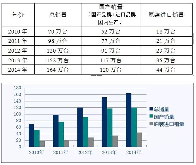 据统计,2014年中国市场燃气采暖热水炉总销量为164万台。其中国产品牌国内销量为87万台,占全年总销量的53%;进口品牌在国内生产销量为33万台,占全年总销量的20%;原装进口品牌销量为44万台,占全年总销量的27%。